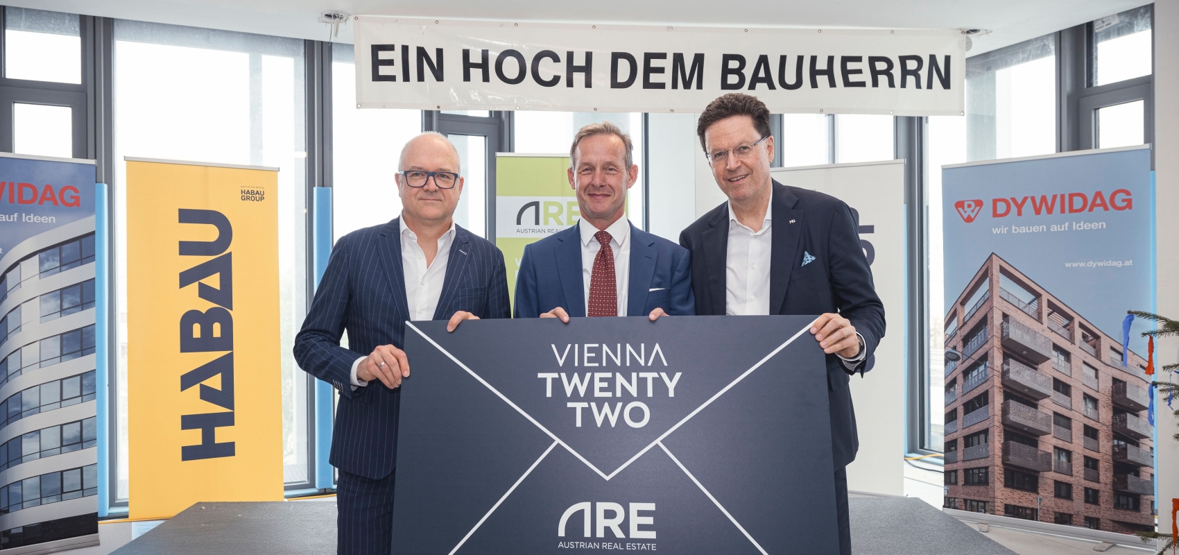 Die ARE Austrian Real Estate (ARE) entwickelt mit dem VIENNA TWENTYTWO ein Ensemble aus insgesamt sechs Bauteilen an einem zentralen Knotenpunkt in der Donaustadt. Während vier Gebäude bereits fertig sind, befinden sich zwei aktuell in Bau. Jetzt hat der höchste Turm mit 44 oberirdischen Geschoßen Dachgleiche erreicht. Das HABAU GROUP Konzernunternehmen HABAU Hoch- und Tiefbaugesellschaft war im Rahmen einer ARGE mit DYWIDAG maßgeblich für den Rohbau, den Estrich sowie den Stahlbau des höchsten Bauteils verantwortlich. Am Donnerstag, den 24. April hat ARE Geschäftsführer Gerald Beck das Gleichengeld für die Bauarbeiter an HABAU Geschäftsführer Hubert Wetschnig und DYWIDAG Geschäftsführer Gerald Höninger übergeben, als Anerkennung für die Fertigstellung des Rohbaus. Die Gesamtfertigstellung ist für Ende 2025 geplant.
