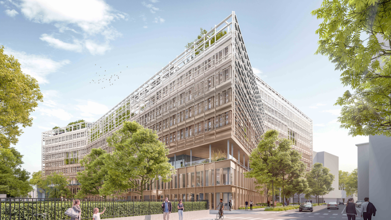 Das neue Gebäude für künftig rund 1.200 Mitarbeiter/innen des Landes besteht aus insgesamt 13 Stockwerken: neun Obergeschosse, Erdgeschoss und zwei Untergeschossen, die mittig mit auskragenden Elementen errichtet werden. Ab dem dritten Obergeschoss wird das Bürogebäude in einer Holz-Hybridbauweise umgesetzt, die aus rund 2.500 Holzträgern und rund 540 Holzstützen besteht.
