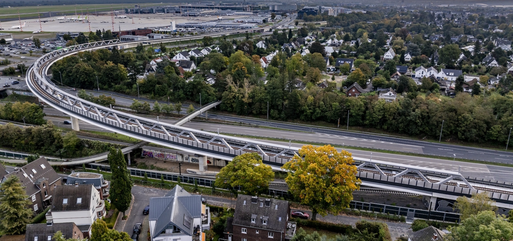 Die neue U81-Stadtbahnbrücke ist 441 Meter lang und überspannt den stark frequentierten Verkehrsknoten „Nordstern“ in Düsseldorf. Sie verbindet den Flughafen direkt mit dem Stadtbahnnetz und verbessert so den öffentlichen Nahverkehr in der Region deutlich. Die Brücke beschreibt dabei eine markante 90-Grad-Kurve und überquert mehrere Verkehrswege: eine sechsspurige Autobahn, eine vierspurige Schnellstraße, vier Zu- und Abfahrtsrampen, einen Kreisverkehr, eine Fußgängerbrücke sowie die Gleise der Rheinbahn. An einigen Stellen verlaufen künftig bis zu vier verschiedene Verkehrswege übereinander. Aufgrund ihrer Länge und der flexiblen Bauweise reagiert die Brücke spürbar auf Temperaturschwankungen – sie dehnt sich aus oder zieht sich zusammen und funktioniert damit wie eine „atmende Brücke“.