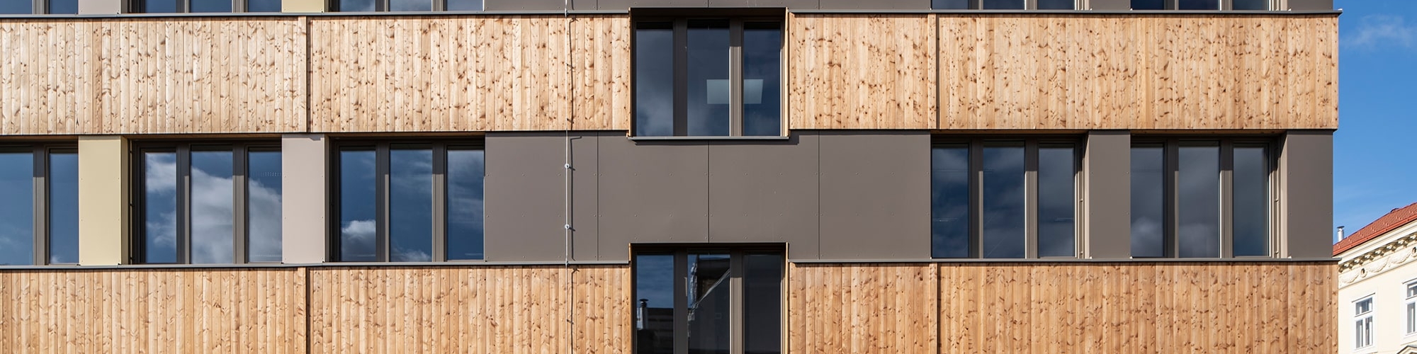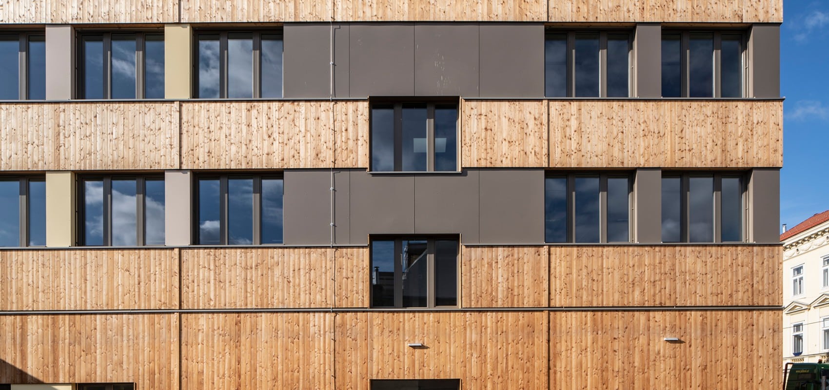 Ein zukunftsweisendes Gebäude für die Bildung: Den Schüler:innen der Diesterweggasse in Wien-Penzing steht seit 2018 ein angemessener Ort des Lernens zur Verfügung. BAUMGARTNER errichtete die gesamte Rohbaukonstruktion mit massiven Brettsperrholzelementen.